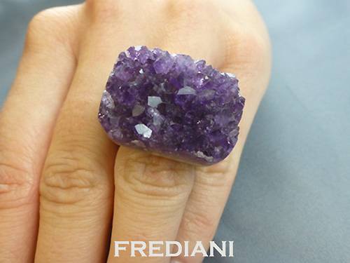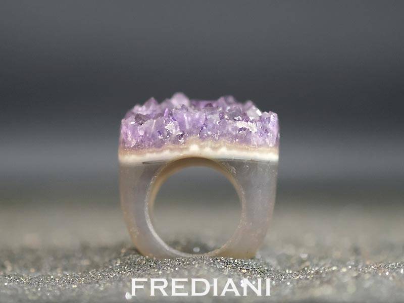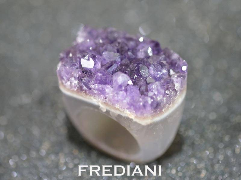 Bague taillée dans la matière brute laissant apparaitre sur le dessus les cristaux d'améthystes.