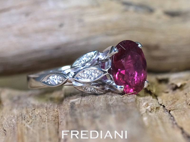 Bague en or blanc 750/000 sertie d'une très belle tourmaline rouge ovale et 8 diamants naturels FVS.