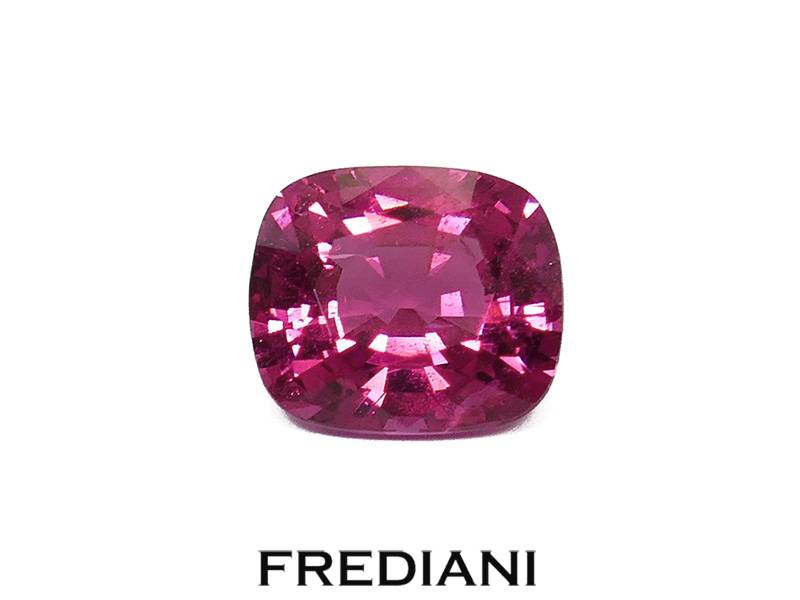 Bague en or rouge 750/000 sertie avec un superbe spinelle rose intense coussin naturel et accompagné de 8 diamants.